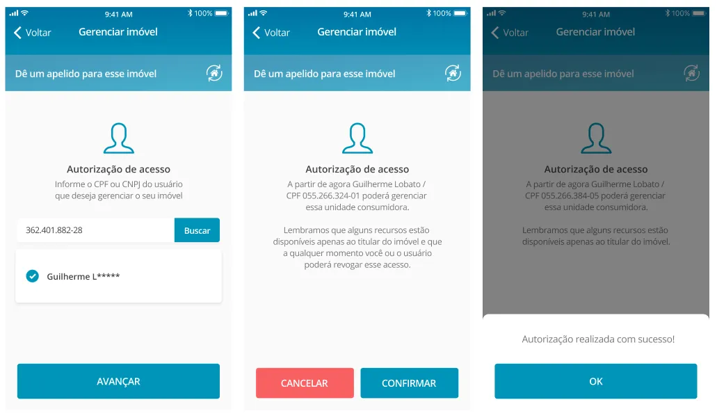 O recurso é permitido apenas para o titular do imóvel, estando autenticado no aplicativo Energisa ON, gerenciando o imóvel desejado. Basta o titular possuir o CPF da pessoa no qual ele deseja adicionar para poder gerenciar o seu imóvel.