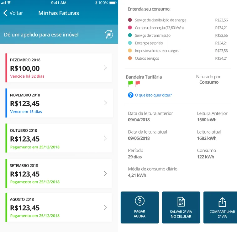 Selecione a fatura que deseja obter a segunda via, no final da tela você terá a opção: Salvar 2ª via no celular ou Compartilhar 2ª via