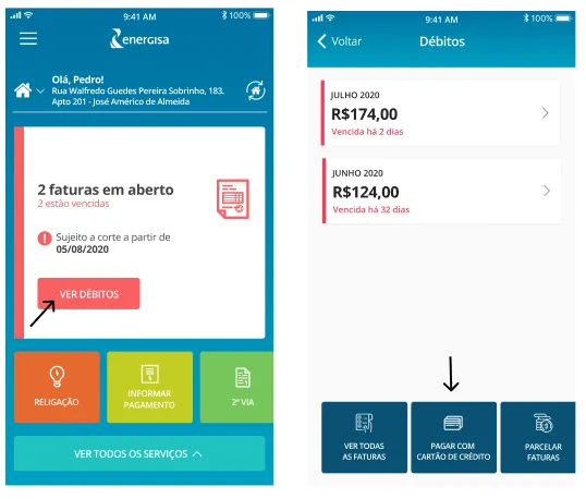 Caso você esteja visualizando o card na tela inicial de faturas ao acessar a opção VER DÉBITOS será listado os débitos que sua UC possui, e na parte inferior oferta a opção de PARCELAR COM CARTÃO DE CRÉDITO.