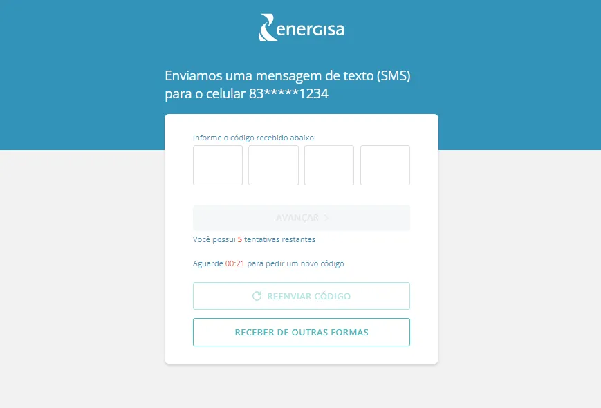 Caso não tenha recebido o código de segurança enviado por SMS ou e-mail, clique em “Receber de outras formas” e selecione o meio que prefere (SMS, e-mail ou WhatsApp).