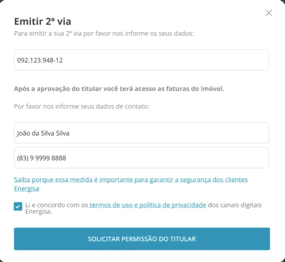 5. Aceite os termos de uso e política de privacidade dos canais digitais Energisa e toque em “Solicitar Permissão do Titular”;