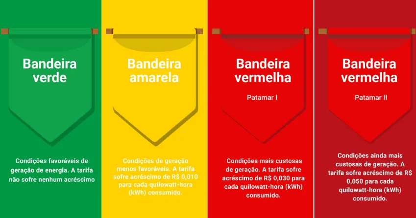 Se existir uma crise hídrica com poucas chuvas nos reservatórios, há a necessidade de se contar com usinas térmicas a base de combustível fóssil que custam muito mais caro que as hidrelétricas. Com as bandeiras, a conta de luz fica mais transparente e o consumidor tem a melhor informação para usar a energia elétrica de forma mais consciente. Confira abaixo o que cada bandeira significa: