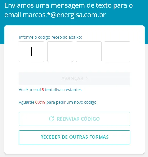 5. Informe o código de 4 dígitos recebido e clique em “Avançar”.