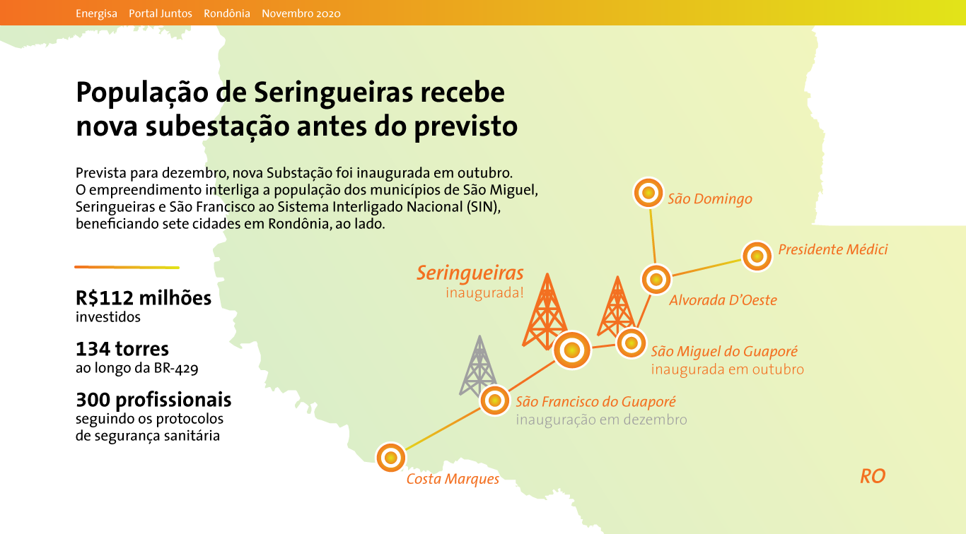 Dois meses antes do previsto, a Energisa entregou uma nova subestação para os moradores de Seringueiras. Com investimento de R$ 112 milhões, o empreendimento interliga a população dos municípios de São Miguel, Seringueiras e São Francisco ao Sistema Interligado Nacional (SIN) - o mesmo que atende a maioria dos brasileiros com energia elétrica.