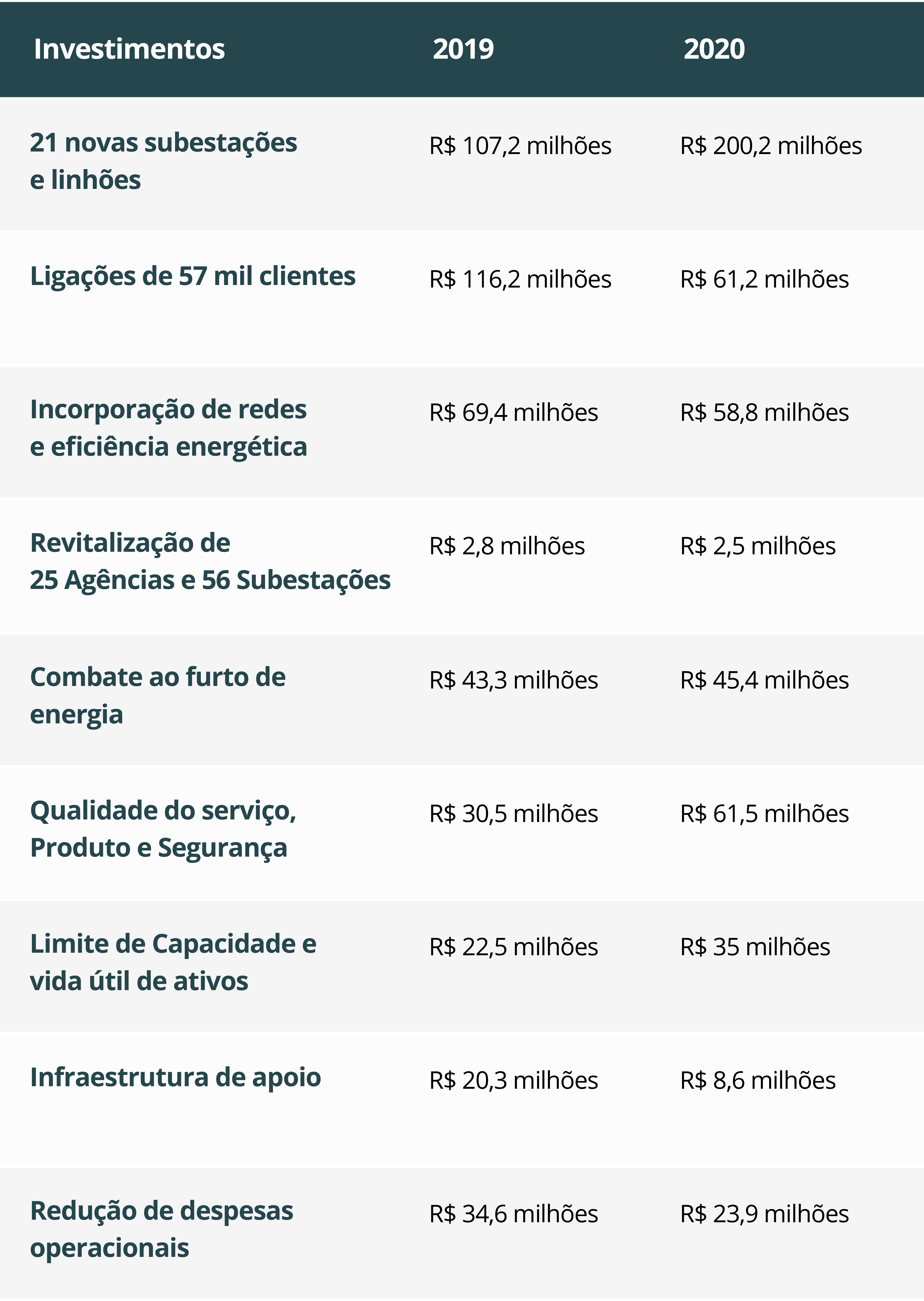Veja na tabela abaixo o resumo dos investimentos realizados em 2019 e 2020. Nos vídeos, estão depoimentos colhidos pela Energisa em suas incursões pelo estado. Os municípios de Espigão do Oeste, Alta Floresta, Alvorada do Oeste e Jaru estão entre os destinos dos investimentos do grupo em 2020.